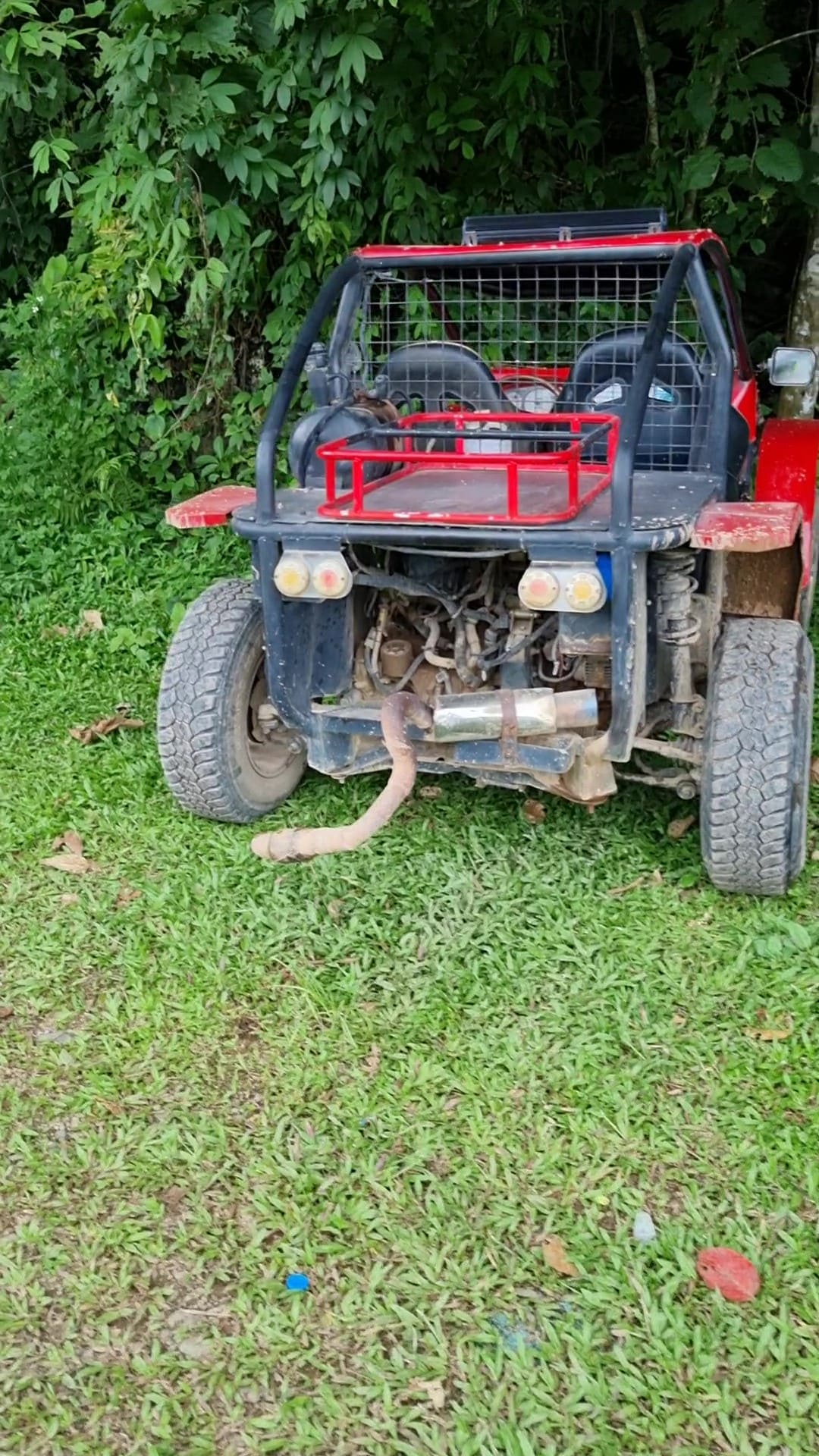 Keby vedľa nás neparkovala iná bugina, asi by sme na to len tak neprišli. Hneď nám ale udrel do očí výfuk, ktorý bol v porovnaní s tým druhým vykrútený ako paragraf. Pravdepodobne sme ho niekde v tej džungli utrhli, na naše šťastie sme ho ale cestou nestratili. Všimli sme si, že už bol niekoľkokrát zváraný, no aj napriek tomu sme ho  v takomto stave vrátiť nemohli.